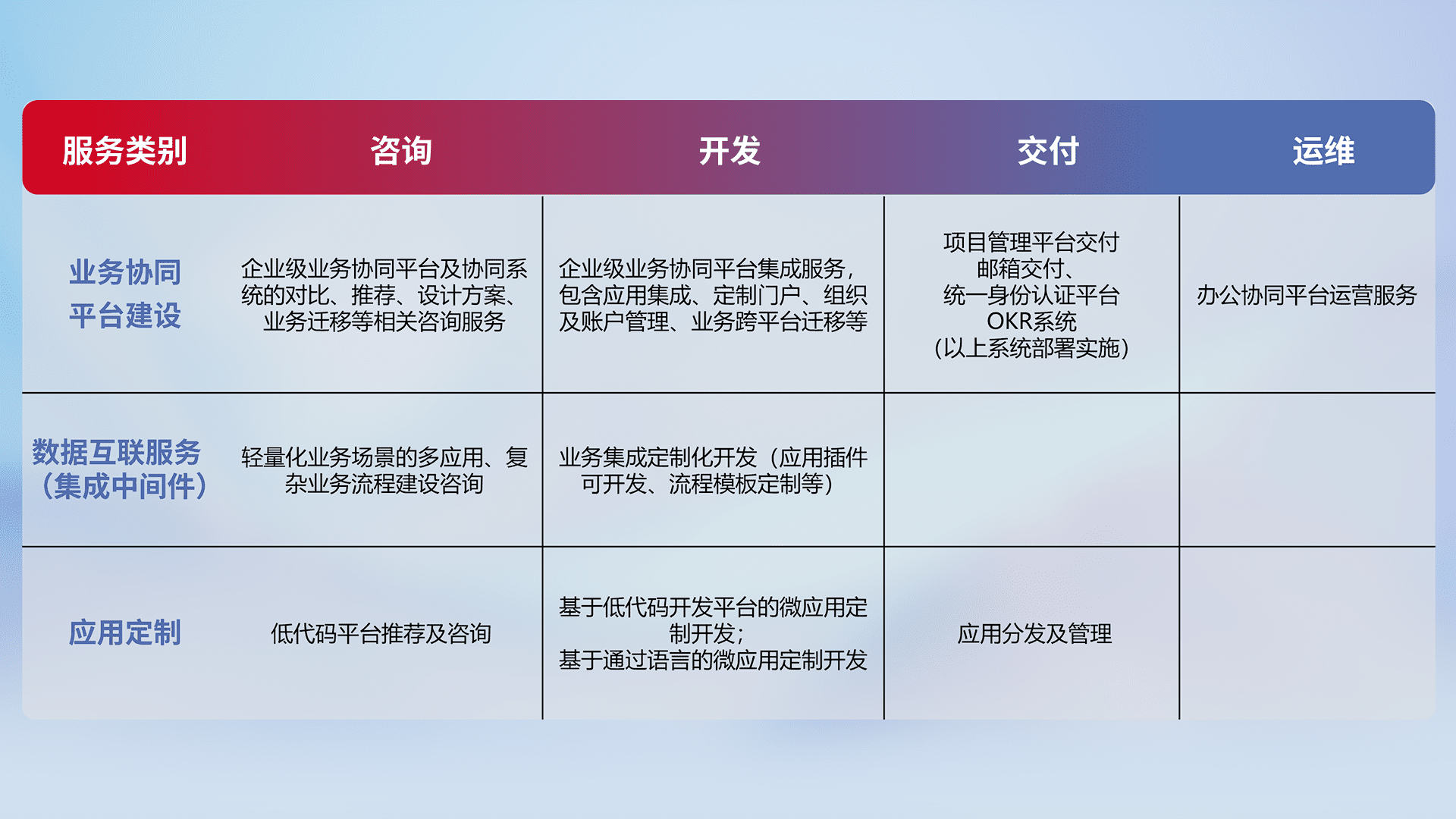 针对钉钉、、、、企微、、IDaas等平台级产品提供产品的规划、、、方案、、、、交付、、、定制化开发等服务,,实现如统一协同办公、、、智能客户服务、、、混合会议管理、、、智能数据查询、、、等业务场景,,,实现数字化转型。。。。