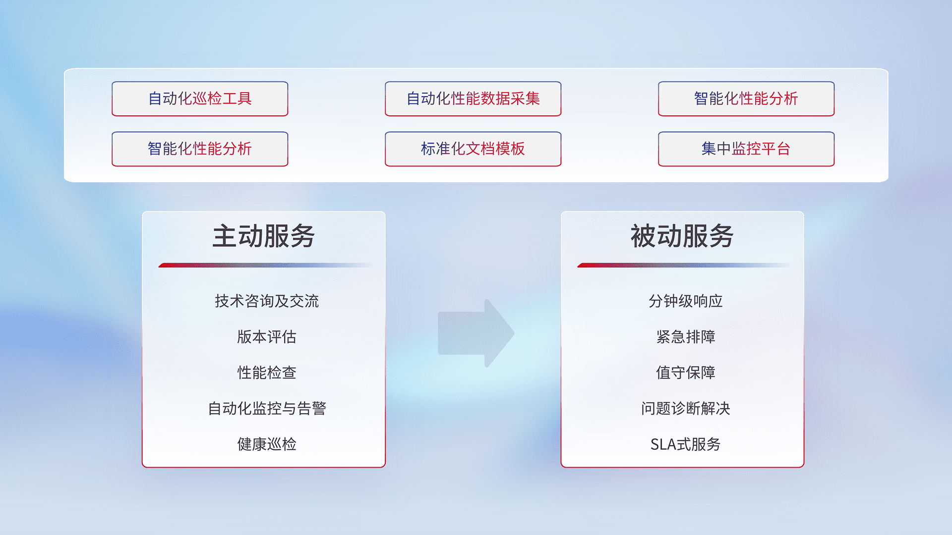 智能化工具和标准化文档,,,保障服务质量,,提供主动服务(包含技术咨询、、、版本评估、、、、性能检查、、自动化监控与告警、、、、健康巡检)和被动服务包含(分钟级响应、、紧急排障、、、、值守保障、、、问题诊断解决、、SLA服务)。。。。