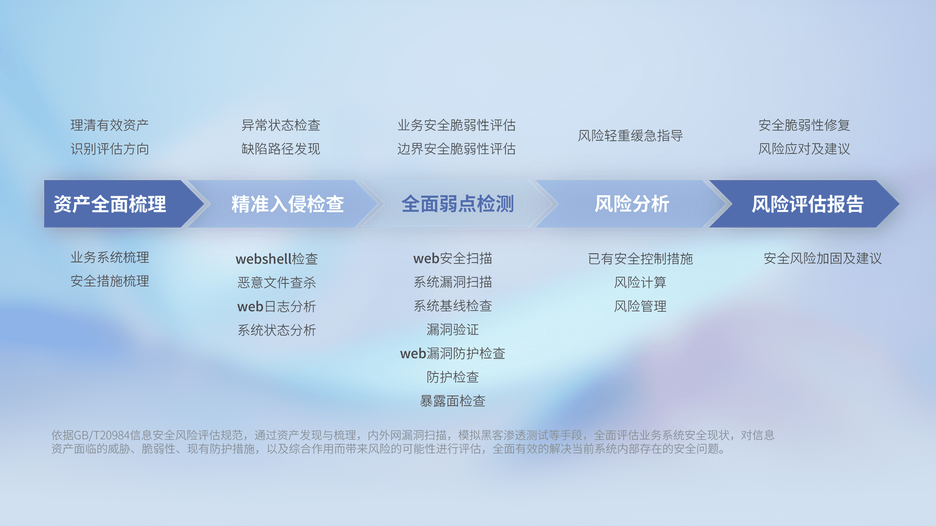 针对客户行业特性,,,,以专业的安全服务+多厂商联合解决方案提供专属的一站式安全管理服务,,,,帮助客户全面感知网络空间威胁,,,,基于识别、、检测、、、分析、、、防护、、监测、、、响应的服务理论模型,,,,从方案咨询、、、集成交付、、、评估验证、、优化加固、、运维运营,,致力于为客户提供完整的闭环管理式安全服务。。。。以实战经验为客户打造高抵御风险的安全体系,,,帮助客户发现威胁、、、对抗威胁、、、处置威胁,,,不断积累安全对抗能力,,,持续保障数字化安全。。